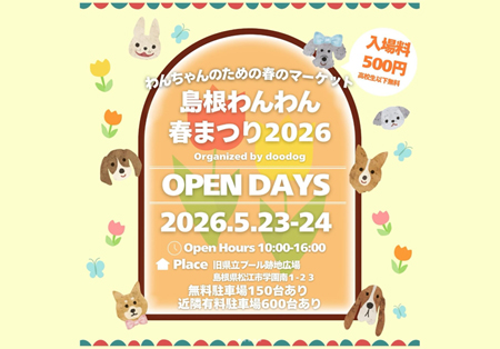 島根県松江市 旧県立プール跡地広場にて、「島根わんわん春まつり 2026」が2026年5月23日(土)・24日(日)に開催。