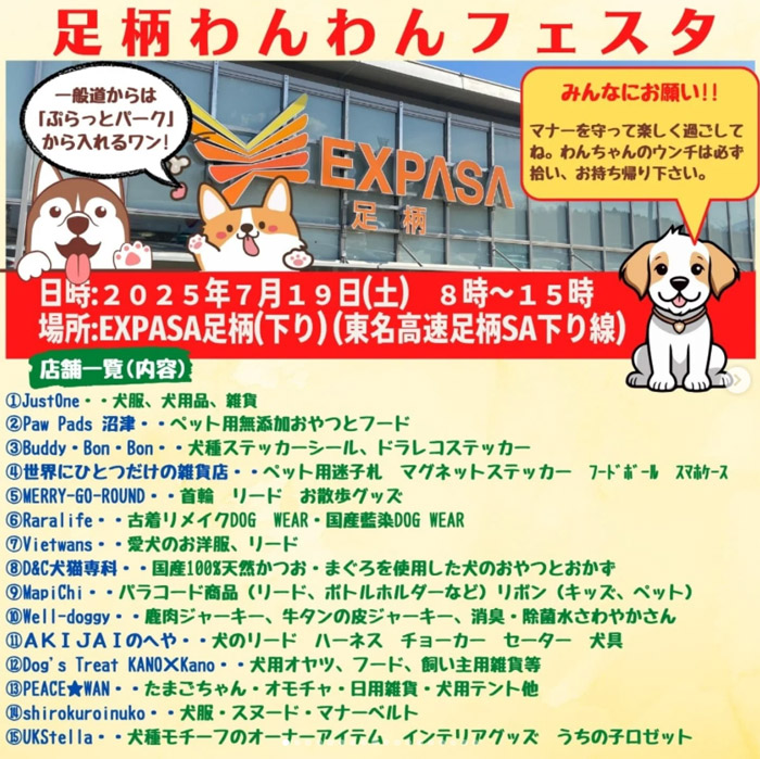 静岡県駿東郡 東名高速足柄SA(下り) EXPASA足柄にて、「足柄わんわんフェスタ」が2025年7月19日(土)に開催。
