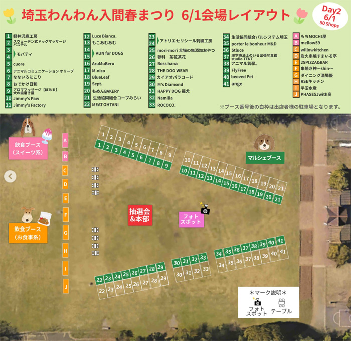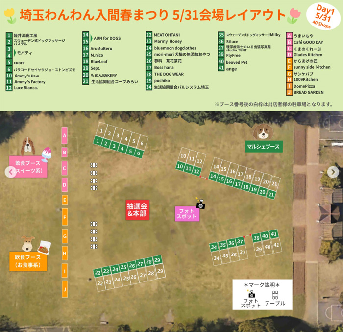 ・2日間で50~60店舗のお店が集まるわんちゃんと一緒に楽しめる春マーケットは、わんちゃん用のおやつ、フード、服、グッズなど埼玉県内外から様々なお店が集まります。もちろんキッチンカーも出店!!春を感じながら多種多様なお食事をお楽しみください