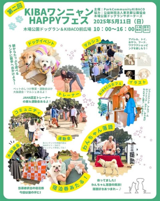 東京都江東区 木場公園ドッグラン&KIBACO前広場にて、「第2回 KIBAワンニャンHAPPYフェス」が2025年5月11日(日)に開催。