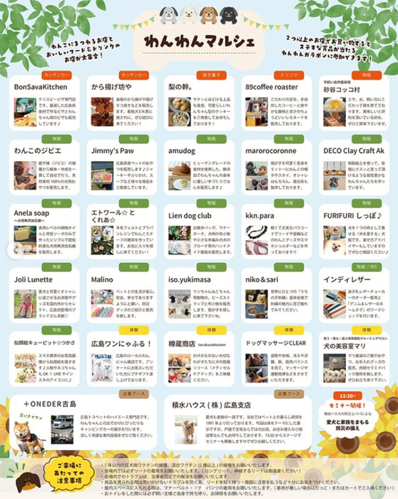 わんちゃんのお店が20店舗、おいしいフード&ドリンクのお店が5店舗、企業ブースが2社、CLiPに大集合!