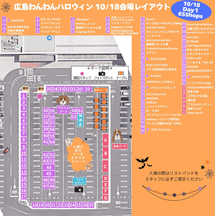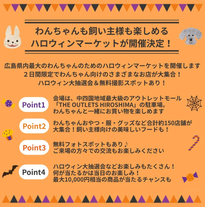 2日間で合計150〜200店舗が集まる中四国最大級のわんちゃんと一緒に楽しめるハロウィンイベントをぜひお楽しみください