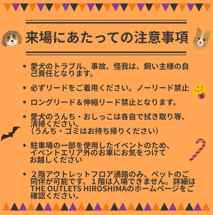 ・2階アウトレットフロア通路のみ、ペットのご同伴が可能です。1階は入場できません。詳細はTHE OUTLETS HIROSHIMAのホームページをご確認ください。
