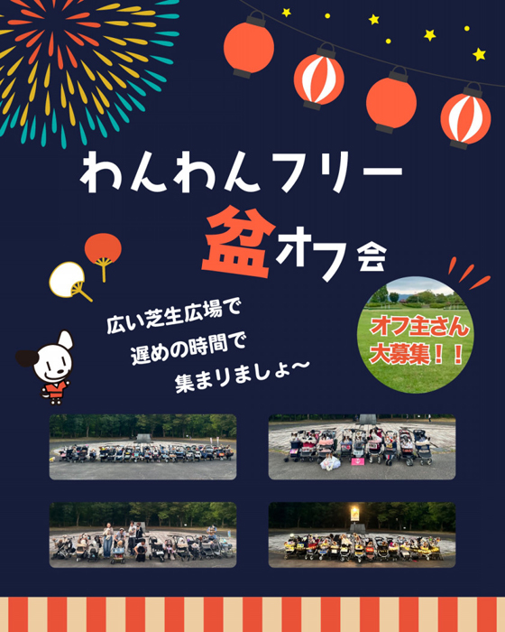 大阪府岸和田市にある とんぼ池公園(大芝生広場)&WHATAWON (室内)フロアディスコボウルにて「まなぼうDOG!盆ナイト inとんぼ池公園&ワタワン」が2025年8月15日(金)・16日(土)に開催。