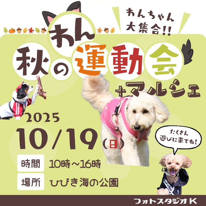 福岡県北九州市 ひびき海の公園 にて、「秋のわん運動会&マルシェ」が2025年10月19日(日)に開催。