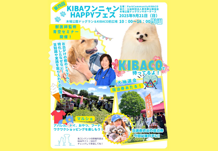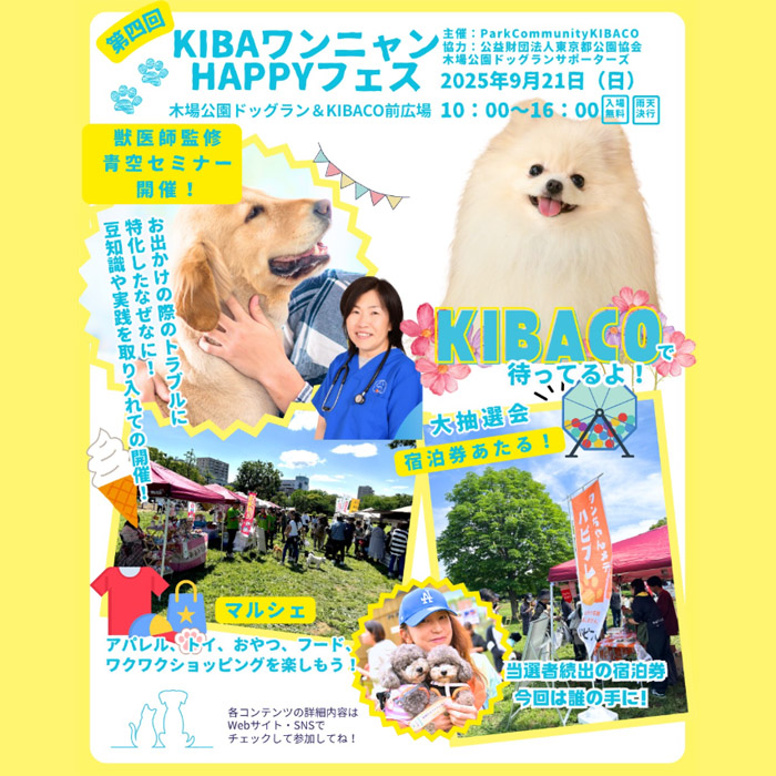 東京都江東区 木場公園ドッグラン&KIBACO前広場にて、「第4回 KIBAワンニャンHAPPYフェス」が2025年9月21日(日)に開催。