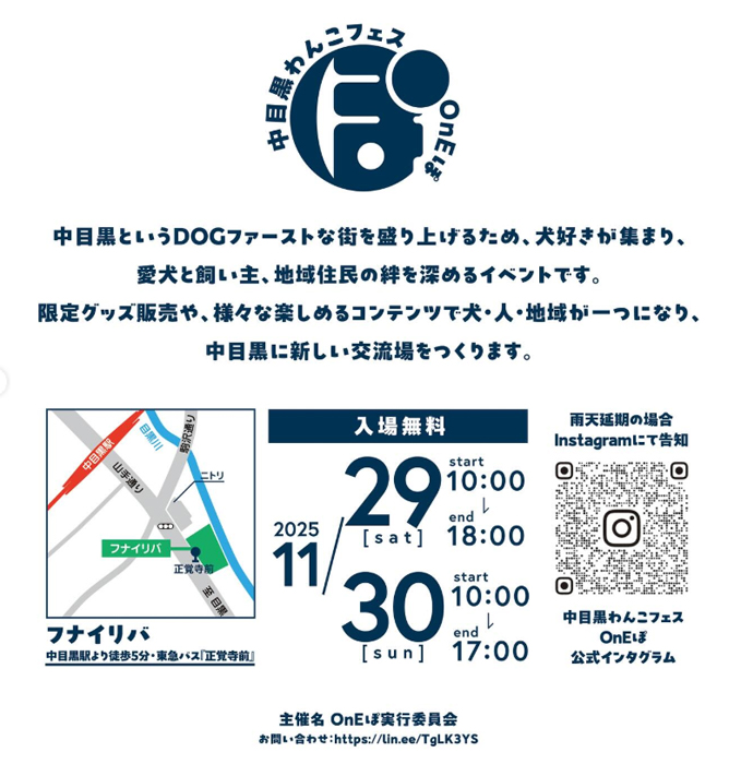 東京都目黒区にある中目黒船入場 憩の広場にて「第3回 中目黒わんこフェス OnEぽ」が2025年11月29日(土)・30日(日)に開催。