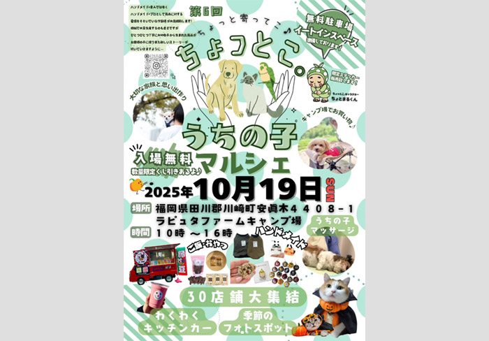 福岡県田川郡 ラプュタファームキャンプ場にて、「ちょっとこ。うちの子マルシェ」が2025年10月19日(日)に開催。