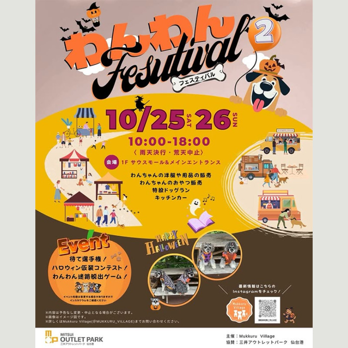 宮城県仙台市 三井アウトレットパーク仙台港 1F サウスモール&メインエントランスにて「第2回 わんわんfestival」が2025年10月25日(土)・26日(日)に開催予定。
