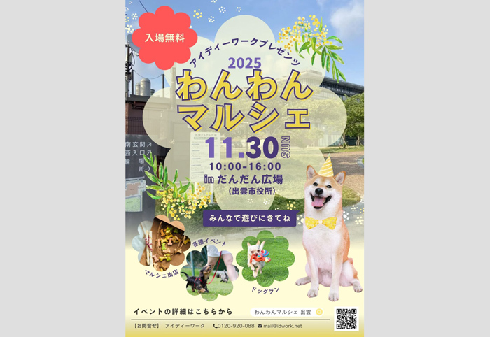 島根県出雲市 出雲だんだん広場にて、「第2回 わんわんマルシェ」が2025年11月30日(日)に開催。