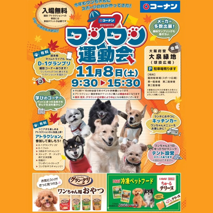 大阪府堺市 大泉緑地 球技広場にて、「第2回 コーナンpresents ワンワン運動会」が2025年11月8日(土)に開催。