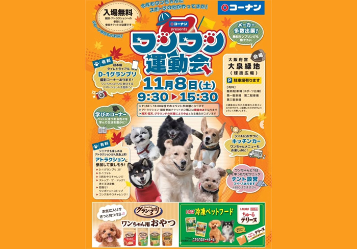大阪府堺市 大泉緑地 球技広場にて、「第2回 コーナンpresents ワンワン運動会」が2025年11月8日(土)に開催。