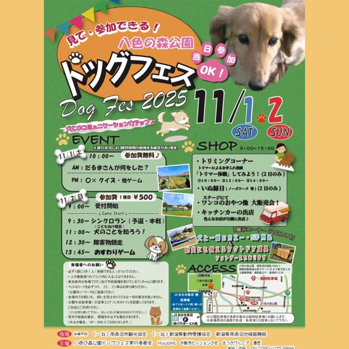 新潟県南魚沼市にある八色の森公園にて、「八色の森公園ドッグフェス 2025」が2025年11月1日(土)・2日(日)に開催。