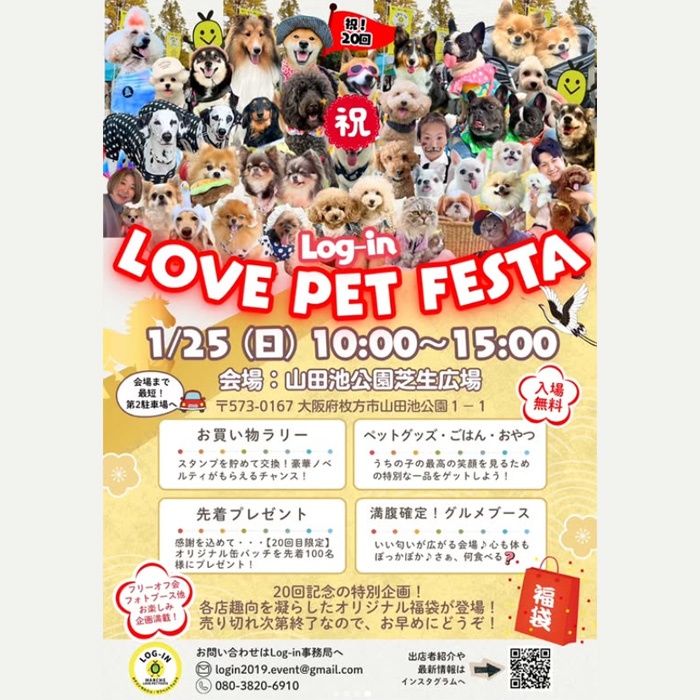 大阪府枚方市にある山田池公園 芝生広場にて、うちの子いちばん♡「Log-in LOVE PET FESTA ログイン ラブ ペットフェスタ vol.20」が2026年1月25日(日)に開催。