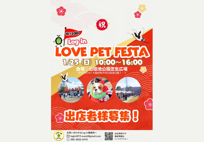 大阪府枚方市にある山田池公園 芝生広場にて、うちの子いちばん♡「Log-in LOVE PET FESTA ログイン ラブ ペットフェスタ vol.20」が2026年1月25日(日)に開催。