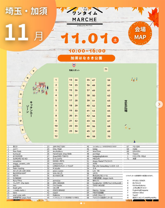 埼玉県加須市にある加須はなさき公園 芝生広場ゾーンにて「第13回 ワンタイム MARCHE」が2025年11月1日(土)に開催。