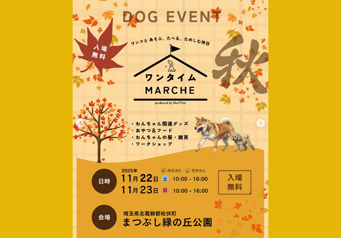埼玉県北葛飾郡にあるまつぶし緑の丘公園 にて「ワンタイムマルシェ まつぶし緑の丘公園 秋」が2025年11月22日(土)・23日(日)に開催。
