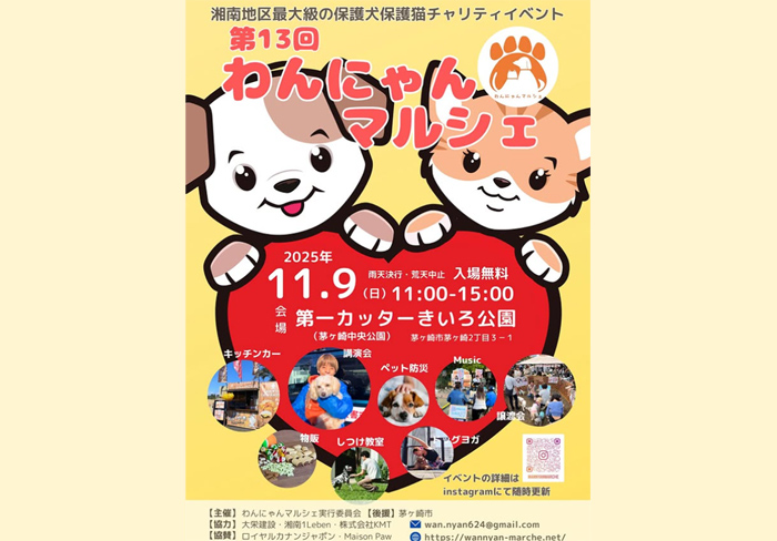 神奈川県茅ヶ崎市にある第一カッターきいろ公園(茅ヶ崎中央公園)にて「第13回 わんにゃんマルシェ」が2025年11月9日(日)に開催。