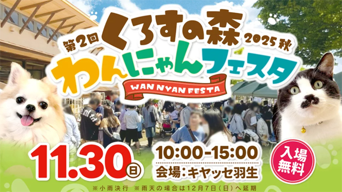 埼玉県羽生市にあるキヤッセ羽生にて「第2回 くろすの森 わんにゃんフェスタ」が2025年11月30日(日)に開催。