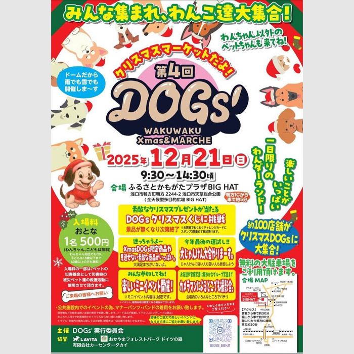 岡山県浅口市にある、天草総合公園 ふるさとかもがたプラザ BIG HATにて「第4回 DOGs ドッグス」が2025年12月21日(日)に開催!