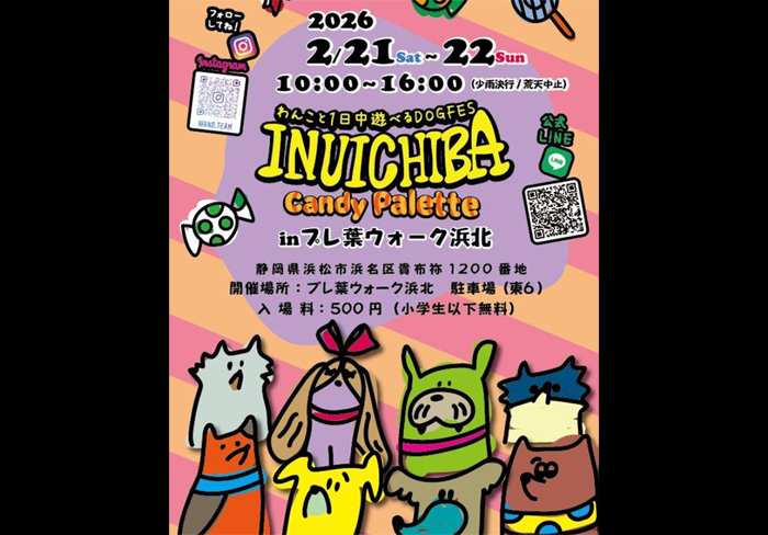 静岡県浜松市にあるプレ葉ウォーク浜北 駐車場(東6)にて「犬市場 Candy Palette in プレ葉ウォーク浜北」が2026年2月21日(土)・22日(日)に開催。