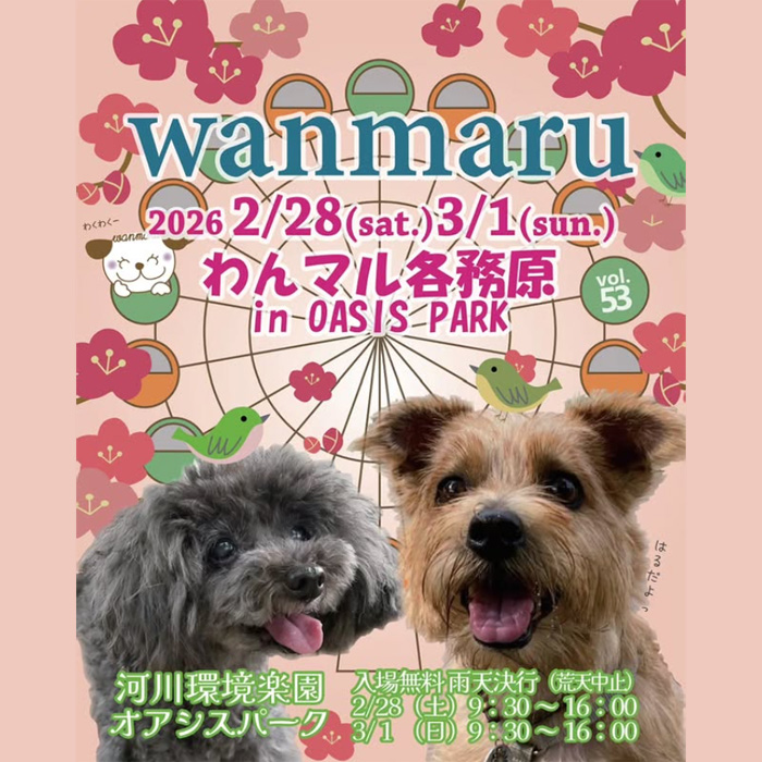 岐阜県各務原市 河川環境楽園オアシスパークにて、「第53回 わんマル各務原 in オアシスパーク」が2026年2月28日(土)・3月1日(日)に開催。