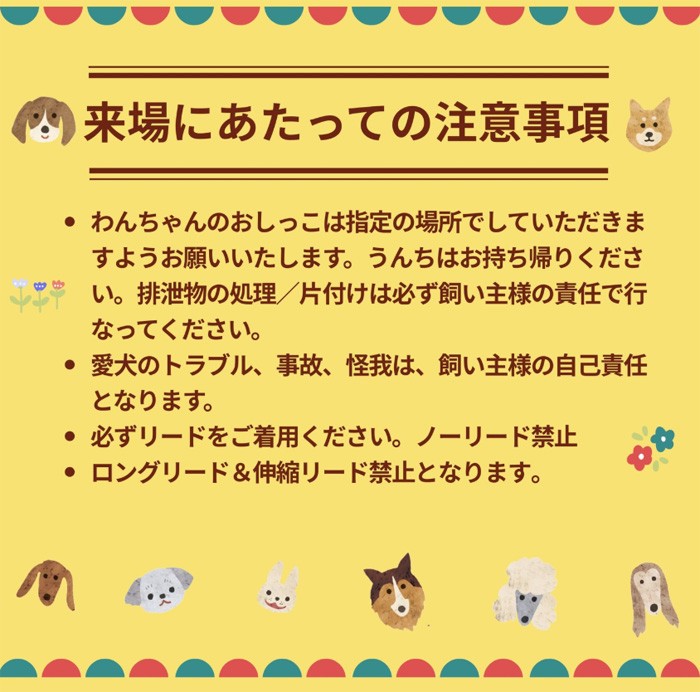 * わんちゃんのおしっこは指定の場所でしていただきますようお願いいたします。うんちはお持ち帰りください。排泄物の処理/片付けは必ず飼い主様の責任で行なってください。