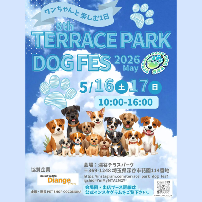 埼玉県深谷市 深谷テラスパーク(第1会場 深谷花園駅〜ふかや花園プレミアム・アウトレット間 緑地広場、第2会場 深谷テラスパーク内円形広場)にて、「第8回 TERRACE PARK DOG FES 2026 テラスパークドッグフェス」が2026年5月16日(土)・17日(日)に開催。