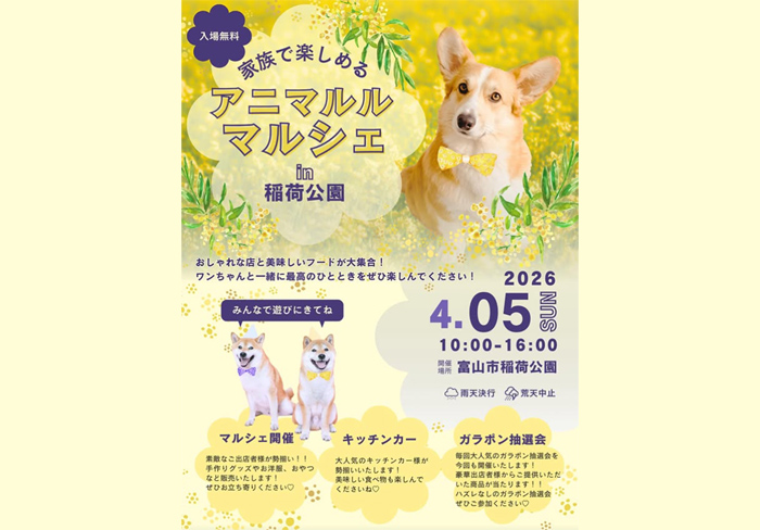 富山県富山市 稲荷公園にて、「第7回 animaloulou marche アニマルルマルシェ」が2026年4月5日(日)に開催。
