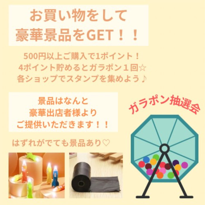 当日は、各出店者様から500円お買い物毎に1ポイント