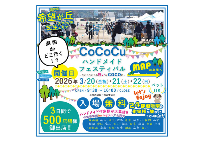滋賀県蒲生郡 望が丘文化公園 芝生エリアにて、「CoCoCuハンドメイドフェスティバル 2026」が2026年3月20日(金・祝)~22日(日)に開催。