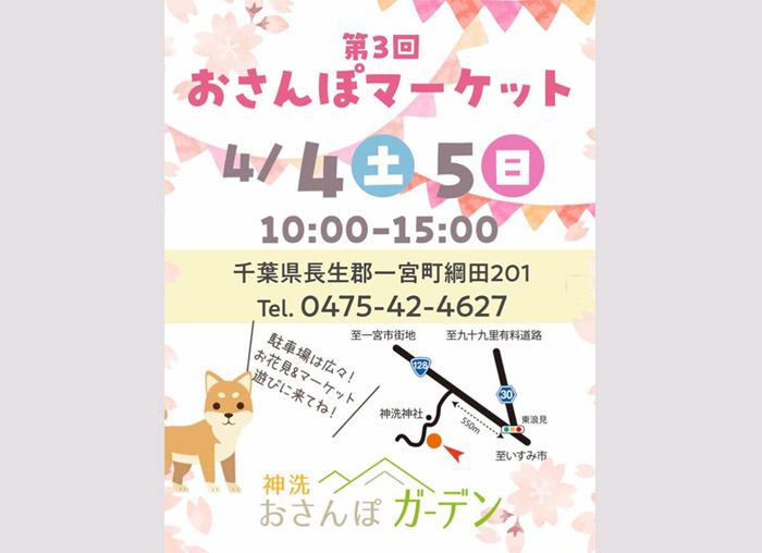 千葉県長生郡にある、神洗おさんぽガーデン内にて「第3回 おさんぽマーケット」が2026年4月4日(土)・5日(日)に開催。