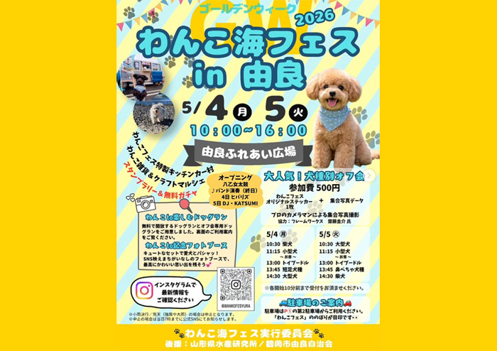 山形県鶴岡市 由良ふれあい広場にて、「わんこ海フェス2026 in 由良」が2026年5月4日(月・祝)・5日(火・祝)に開催。