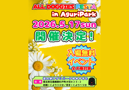 埼玉県北葛飾郡にある道の駅アグリパークゆめすぎと ひだまり広場にて、「ALL DOGGIES FESTA 2026 SPRING in アグリパークゆめすぎと」が2026年5月17日(日)に開催。