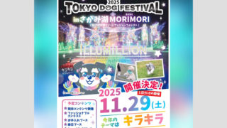お出かけ TOKYO DOG FESTIVAL 2025 【さがみ湖 MORI MORI】 2025年11月29日(土)開催 神奈川県相模原市にあるさがみ湖 MORI MORIにて「TOKYO DOG FESTIVAL 2025」が2025年11月29日(土)に開催。 全犬種対象のワンちゃんのイベントです。 会場のさがみ湖MORI MORIはワンちゃんと一日遊べるスポット! 夜は関東三大イルミネーション「さがみ湖イルミリオン」もお楽しみいただけます。 2025.11.28 お出かけイベント情報・ランキング関連神奈川県関東地方