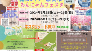 兵庫県三木市 ネスタリゾート神戸にて「わんにゃんフェスタ」が2024年6月1日(土)・2日(日)に開催予定。 全国各地からわんにゃんのためのSHOPが大集合! 世界に一つ!ウチの仔雑貨・わんこ洋服・わんにゃん用品・わんにゃん雑貨・おやつetc